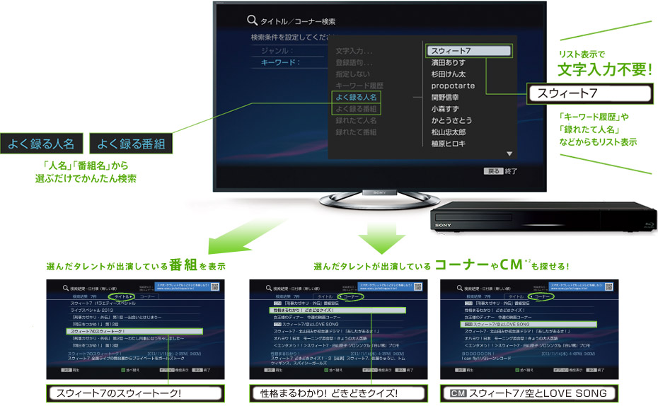 例えば、よく録画するタレントは、上位にランクインされるから、見つけるのが簡単。表示されている人名を選択すれば、出演番組を一覧表示します。さらに出演コーナーやCMも面倒な操作なしに探すことができます。