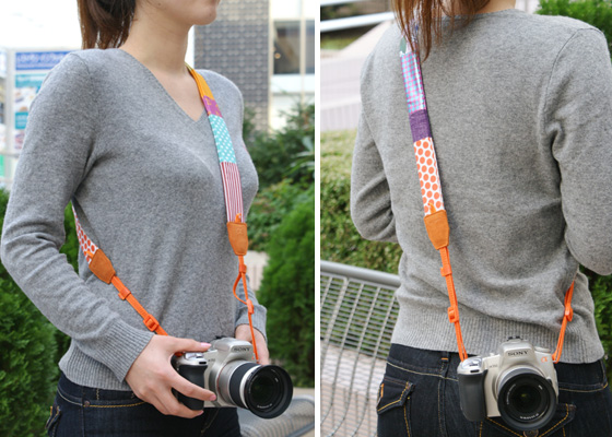 女性用のストラップとして、カメラをななめ掛けしやすく、ローアングル撮影にも適した長さ約90cm仕様です。また、デザインも女性に人気の10種類のカラフルなデザインパターンのパッチワークになっています。