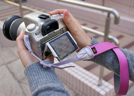 でも"α350"や "α300"のライブビューを使って撮影する場合は、首からストラップをかけていると撮影しづらくなりますよね。そういうときはストラップを首から外しますが、そのままではストラップがジャマになったり、カメラを落とす危険もあります。そんなときストラップを手に1回巻いて持つと、液晶を見ながらでも落下しにくく楽に撮影できます。