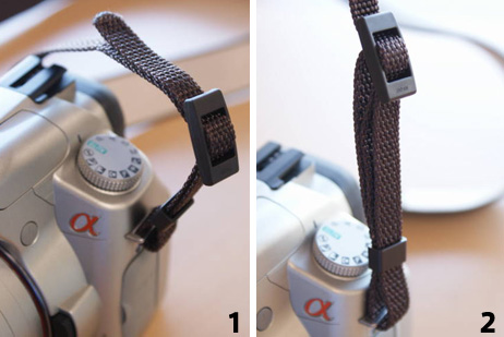 また、肩にカメラを掛けて持ち歩くタイプの方は、長いままだとカメラがブラブラしてジャマになるので、ストラップの長さを短めにするのも1つの方法です。この場合、先端を写真のように結べば、短くコンパクトな持ち方ができ、また、ちょっとオシャレな感じにもなります。