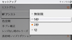 メニュー設定:MFアシスト”切”/”2秒”/”5秒”/”無制限”(デフォルトは2秒)