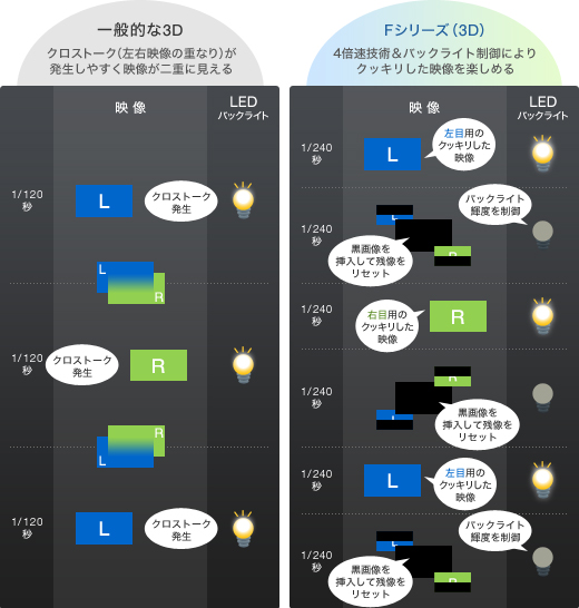 一般的な3D再生(1秒間に左右60コマずつ/合計120コマ)では、交互に表示する左目用の映像と右目用の映像が重なってしまう「クロストーク」現象が発生しやすくなります。3D対応Fシリーズでは世界最高水準(*)の高速応答と4倍速駆動を可能にする液晶パネルを新開発し、左右の映像の合間に黒画像を挿入し再生(1秒間に左右120コマ、黒画像120コマ/合計240コマ)。これにより、「クロストーク」現象を極限まで抑えることに成功しました。さらにLEDバックライトの輝度をコマごとに細かくコントロールし、左右それぞれの映像がクッキリ描かれた瞬間にLEDを高発光することで、明るく美しい3D映像を実現しました。