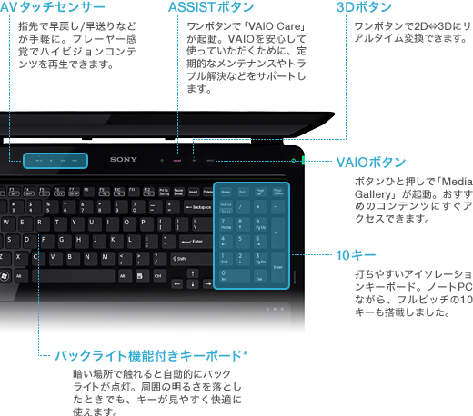 優雅なスタイリングとともに、使いやすさも徹底追求。機能的に配置された各種ボタンやフルピッチの10キーなど、細部までVAIOならではのこだわりがこめられています。さらに、暗い場所でも快適なバックライト機能搭載の英字配列キーボードも用意(*)。3D映像も楽しめるハイビジョンシアターとして、そしてクリエイティブマシンとして、スマートに使いこなせます。