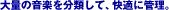 ハードディスクに集めた音楽は、好きなジャンルに分けて、ツリー状にして管理できます。好きな曲をセレクトしたオリジナルアルバムやドライブミュージックなど、目的に応じてプレイリストにまとめておけば、再生やメモリースティックなどへチェックアウトする際に便利です。お気に入りボタンをクリックすれば、再生中の曲もリストに追加することができます。