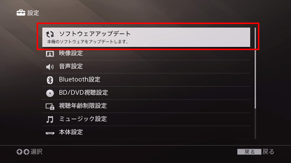 なお、すでに本機をインターネットに接続済みで、テレビ画面上に表示される「本体設定」のソフトウェアアップデート通知が「入」に設定されている場合、自動でアップデートの確認画面が表示されますので、「はい」を選んでアップデートを行ってください。