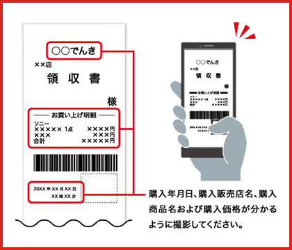 購入年月日、購入販売店名、購入商品名および購入価格が記載された対象商品のレシートまたは領収書を撮影した画像データ