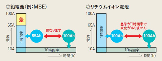 一般的な鉛蓄電池(MSE)は10時間率と1時間率で容量に差がありますが、リチウムイオン電池は10時間率と1時間率で容量差はほとんどありません。非常電源のように短時間で放電する場合でも、定格容量分をフルに活用することができ、電池導入コストを削減できます。