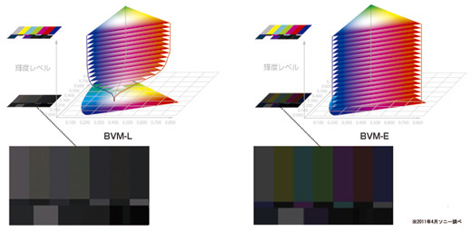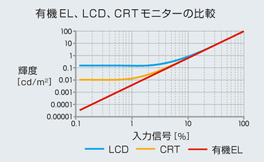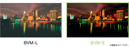 広色域有機ELパネルと独自の3D LUT(Look Up Table)を使用したカラーマネージメントシステムにより、放送規格ITU-R BT.709、EBU、SMPTE-Cの色域を正確に再現します。また、より広色域のデジタルシネマ向けの色域(*)にも対応しています。