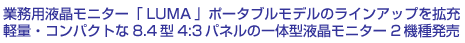 『LUMA』シリーズでは、既発売のマルチフォーマット液晶モニター5機種(32型、23型、21型、17型、15型)とSDフォーマット液晶モニター4機種(20型、14型各2モデル)、ラックマウント液晶モニター3機種(7型2連、5.6型3連、4型4連)を、そしてポータブルモデルとして既発売のHD・SD信号入力に対応したマルチフォーマット液晶モニター(8.4型1モデル)を展開しています。今回これらにポータブルモデルでコストパフォーマンスに優れた『LMD-9020』『LMD-9030』の2モデルを発売することにより、入力信号、画面サイズ、設置条件で選べる全15モデルのラインアップを取り揃え、業務用モニター市場の幅広いアプリケーションをサポートしてまいります。