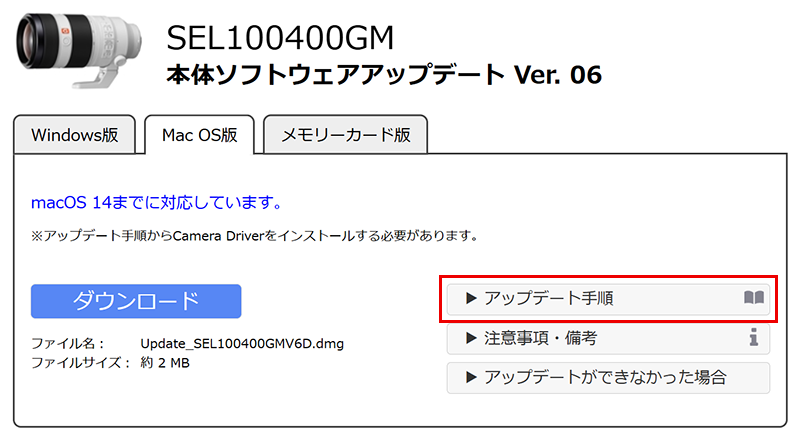アップデートする製品の本体ソフトウェアアップデートページを開き、Mac OS版のアップデート手順の中からSony Camera Driverをダウンロードしてください。
