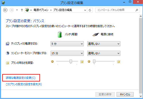 - [プラン設定の編集]画面が表示されるので、[詳細な電源設定の変更]を選択します。