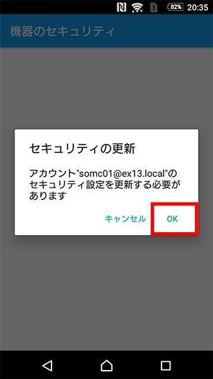 EASポリシーの自動更新時もしくは、Eメールアプリの更新時に、ステータスバーに通知アイコンが表示され、選択すると左画面のポップアップを表示いたします。(画面遷移は下記手順)