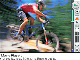 「クリエ」付属の「Image Converter」「Giga Pocket Plug-in」で変換した動画ファイル、モバイルムービー対応製品で録画した動画ファイルのみ再生可能です。動画ファイルにはQuickTimeファイル形式を使用しています。「Image Converter」「Giga Pocket Plug-in」は、「Do VAIO」には対応しません。「Do VAIO」にも対応する「Image Converter」の新バージョンをクリエホームページ内「サポート」にて無償ダウンロード提供します(10月開始予定)。 |