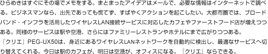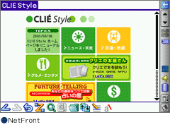 「クリエ」PEG-UX50は、横型ワイド液晶(480×320ドット)を採用。WEBブラウザー「NetFront」で、ホームページもパソコン上で見慣れた横長画面で閲覧できます。ページを最適化して表示する機能を備えているので、横スクロールすることなくページを閲覧できます。自動巡回機能を利用すれば、指定したWebサイトを「クリエ」に取り込めます。自宅のワイヤレスLANでWebページを取り込み、移動中に読む楽しみを実現します。
