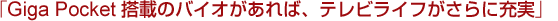 Pocket」搭載のバイオなら「TVscape」の画面上でそのまま録画したい番組をタップして、HotSyncでバイオに転送できます。録画した番組はメモリースティックPRO(最大1GB)に書き出して、通勤電車の中でも「クリエ」で再生して楽しめます。横型ワイド液晶と高画質で、モバイルでも充実のテレビライフを実現しました。