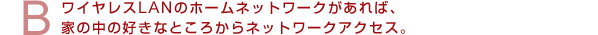 「クリエ」PEG-UX50をワイヤレスLANホームネットワーク に接続すれば、家中の好きなところからネットワークアクセスが可能です。リビングでテレビを楽しみながら、番組のホームページへアクセスしたり、ソファーの上でくつろぎながらメールの読み書きができます。「クリエ」PEG-UX50は、自宅でもそのワイヤレス機能を活用できるのです。