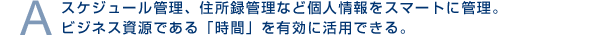 | ※個人情報管理(PIM)データは、アプリケーション単位でのソートや、キーワードによる横断検索が可能です。データの入力時に一定のキーワードを含めておけば、別々のアプリケーションで管理されているデータが検索機能により高速に一覧表示されます。 |