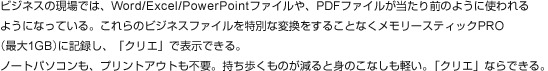 「クリエ」PEG-UX50は、最大1GBの大容量を誇る「メモリースティックPRO」に対応。大容量のビジネスデータもスマートに持ち歩くことができます。「Data