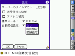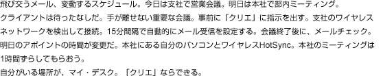「CLIE Mail」には、一定の間隔や時刻を指定してメールを自動的に受信する機能があります。社内のワイヤレスLANネットワークを活用すれば、いつでもどこでも自分のデスクにあるパソコン同様にメールの送受信ができます。