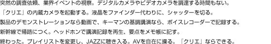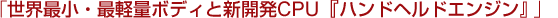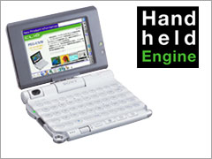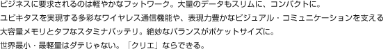ソニーが、「クリエ」のために新開発したCPU「ハンドヘルドエンジン」。AVの高性能化だけでなく、電圧制御機能を世界で初めて実用化し、効率的な電力消費を実現しました。幅103mm×高さ86.5mm×奥行き17.9mmというコンパクトな本体に、3.2型の横型ワイド液晶や、ワイヤレス通信機能を搭載。軽量で耐性のあるマグネシウムボディが、ビジネスマンの軽やかなフットワークを支えます。