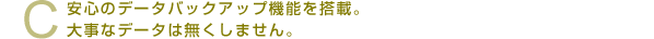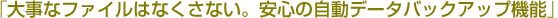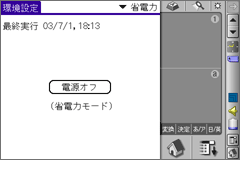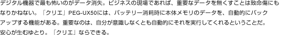PEG-UX50は、大容量メモリーのメリットを活かし、本体内部にバックアップ用のメモリー領域を持ちます。万が一、バッテリーが完全放電してしまうような状態になっても、クリエがその前に自動的にバックアップ処理を行うので、再度充電した時点でデータを復活させることができます。また、「環境設定」アプリケーションの「省電力」メニューを使用すれば、任意の状態でバックアップを作成することもできます。