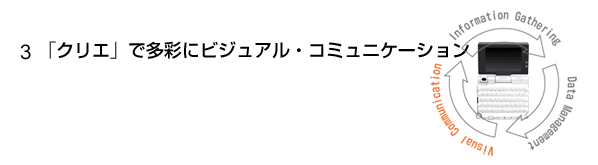 「クリエ」には、ウォークマンで培ったオーディオプレイヤーの技術が生きています。本体の記録メディアやメモリースティックにあるATRAC3形式とMP3形式の音楽ファイルをお手持ちのステレオヘッドホンを使用して手軽に楽しむことができます。また、音楽や音声の再生中でも予定表やメモ帳といったソフトの併用が可能です。「クリエ」ならビジネスにもプライベートにもオーディオ機能をフルに活用できます。