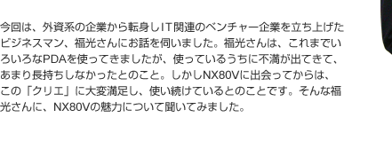 その点NX80Vは、パソコンとの連携がとても簡単なので驚きました。これなら会社の予定を全て簡単に持ち出せるし、ノートパソコンほど大きくないので、どこでも手軽に確認できます。NX80Vは入力しやすいので、外出先で予定を書き込むのも便利ですね。パソコンから外に持ち出すだけではなく、外出先で書き込んだ内容をまたパソコンに戻すという作業も、HotSyncを使えば簡単です。