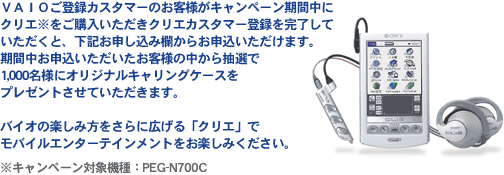 すでにVAIOカスタマーご登録をいただき、お手元にVAIOカスタマーIDをお持ちのお客様の中で、ソニー製パーソナルエンターテインメントオーガナイザー「クリエ」※をご購入いただいたお客様が対象者となります。