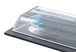 本体には4つの光センサーを装備し、「クリア・シェルター」の底面に光センサーが感知するパターンを施すことで、開閉をコントロールしています。また、スライドするカバーを支える高精度なローラーを本体4箇所に設置し、開閉時のスムーズな動作を実現しました。 |