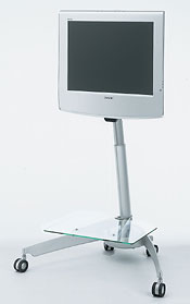 お部屋やテーブルのコーナー等にフィットする省スペースV字型デザインを採用。ガラス棚は取り外しでき、前2度、後10度のチルト、上下約17cmの高さ調節が可能です。スタンド部分には、巻き取り式の電源コード(3m)とACコンセント2口(合計250Wまで)を搭載し、すっきりとした配線を実現しました。 |