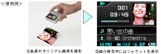 デジタルスチルカメラ機能を搭載した『MZ-DH10P』では、撮影したジャケット写真をパソコン内の「SonicStage Ver.3.0」にアップロードして、楽曲と一緒にアルバムとして保存することが可能です。また『MZ-RH10』ではアナログ録音した音源をパソコンにアップロードする際にWAV形式への変換にも対応しています*3。 |
