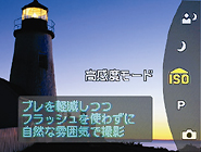 さらに、最高ISO1000までの範囲で感度を自動調節し、手軽にフラッシュなしの自然な撮影が楽しめる「高感度モード」を搭載。モードダイヤルを「ISO」に合わせれば、撮影環境に最適な感度を自動で設定します。 |