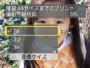 画像サイズを選択する際、それぞれの画像サイズに適した用紙サイズとメモリー残量に応じた撮影可能枚数を表示します。写真の用途に合わせて簡単にA4サイズやメール添付などの画像サイズを選択することができます。 |