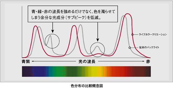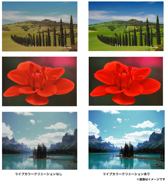 従来のテレビが苦手としていた「真紅」や「深い緑」「鮮やかな青」を映し出し、色鮮やかで繊細な色合いを再現する広色域バックライトシステム“ライブカラークリエーション”搭載。