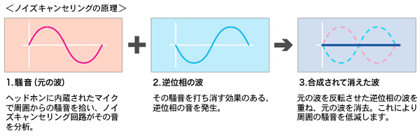 40〜1,500Hzの周波数帯域の騒音をヘッドホンに内蔵されたマイクで検知・分析し、騒音に対して逆位相となる信号を出力し、騒音を低減します。