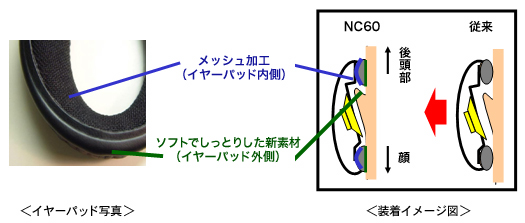 イヤーパッド外側には“ソフトでしっとりした新素材”、イヤーパッド内側には“メッシュ加工”の素材を採用しました。外側には密閉度の高い素材、内側に通気性のある素材を使用することで、イヤーパッドが頭部との設置面にあわせて変形してやすくなり、装着感と密閉度を向上しました。