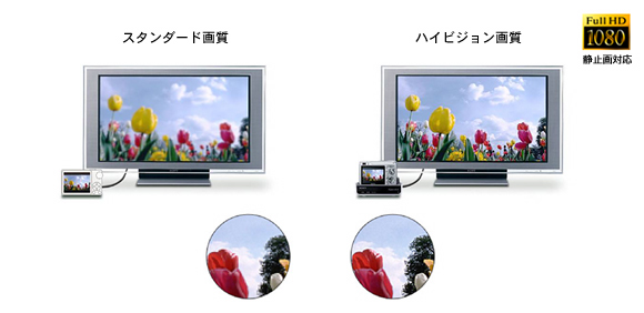 別売のサイバーショットステーションやHD出力アダプターケーブルなどを使用して、“BRAVIA”などのハイビジョンテレビに接続すれば※3、高精細かつ迫力あるハイビジョン画質※4で写真鑑賞を楽しむことが可能です。