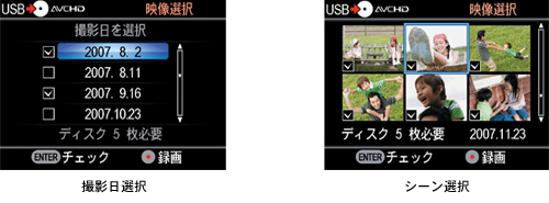 「撮影日選択」「シーン選択」はハードディスク/メモリースティック方式のハイビジョン画質“ハンディカム”およびハードディスク方式のスタンダード画質“ハンディカム”をUSB端子で接続した場合に対応しています。