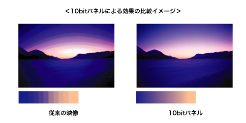 当社フルHDパネル搭載の従来機種X2500/V2500シリーズに比べ約64倍の豊かな階調表現能力を持つ“10bitフルHDパネル”を全機種に搭載し、滑らかなグラデーションを実現します。