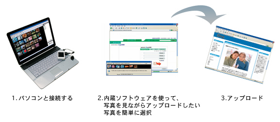 同梱のマルチ端子用USBアダプターとUSBケーブルを使用し、インターネットに接続されたパソコンとつなぐだけで、カメラ本体内蔵のアプリケーションソフトウェア「Picture Motion Browserポータブル」が起動し、外出先のパソコンからでも簡単にお気に入りの写真をウェブにアップロードすることが可能。