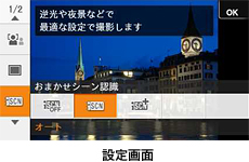 メニューで「おまかせシーン認識」を選択すると、撮影が難しい、「逆光」「逆光&人物」「夜景」「夜景&人物」「三脚夜景」の5つのシーンをカメラが自動で認識し、そのシーンに最適な撮影をおこないます。失敗写真を防ぎ、カメラまかせで簡単にきれいな写真が撮影できます。