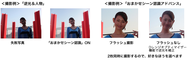 また、「おまかせシーン認識アドバンス」に設定すると、通常のオート設定とカメラが自動で最適化した設定の2枚の写真を同時に撮影するので、失敗を防ぐと同時に自分の好みに合ったほうをあとから選ぶことが可能です。