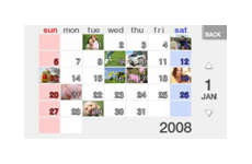 撮影した日付順にカレンダーで表示。見たい日をタッチするとその日に撮影した写真が含まれるアルバムを表示します。月単位で移動ができるので、だいたいの日程から目当ての写真を探すときに便利です。