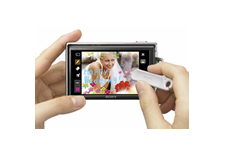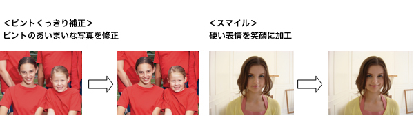付属の「ペイントペン」などで、撮影した画像に文字を書いたり、30種類のペイントや15種類のフレームを使って装飾して、自分だけのオリジナル写真を作成することができます。ペイントした画像はVGAサイズ(640×480)のほかに3メガサイズで、オリジナルサイズの画像とは別に保存できます。撮影した画像の加工や補正がカメラ本体でできる「カメラ内レタッチ」機能を搭載。従来のレタッチに加えて、新たに「ピントくっきり補正」「スマイル」を追加し、パソコンを使わずに、手軽に写真加工が楽しめます。