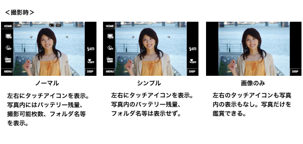 また、3.5型の大画面液晶モニターにタッチアイコンが大きく表示されるので、迷うことなく撮影シーンに合わせて直感的にすばやくカメラの設定をおこなえます。さらに、タッチアイコンが明るい液晶画面上に表示されるため、夜景や夕景など暗い場所でのカメラ操作も快適に行えます。