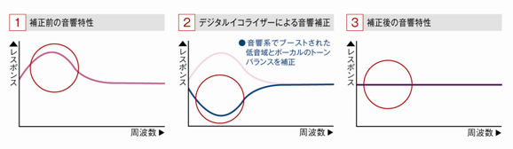 本機はアナログ信号処理では得られない綿密なフィルター特性により、ノイズキャンセリング機能を大幅に向上し、またキャンセリング時に起こる再生音への影響を「デジタルイコライザー」が制御することで高音質再生を実現しています。