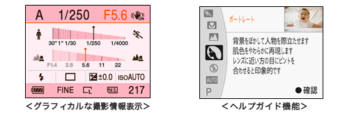 一眼レフカメラを初めて手にするお客様や、コンパクトカメラからステップアップするお客様が、簡単にカメラを使いこなせるように、機能や撮影に関するやさしい説明機能を盛り込んでいます。