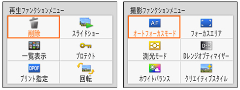 ファンクションボタンを押すと6つの使用頻度の高い機能が表示される「ファンクションメニュー」は、新たにカラーアイコン表示になりました。撮影モードに加え、再生モード時にもファンクションボタンを押すことで再生ファンクションメニューが表示され、「画像の削除」、「スライドショー」、「インデックス表示」、「画像の保護」、「印刷設定」、「画像の回転」の操作が可能になっています。