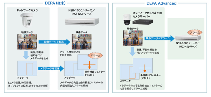 高度な画像処理機能を実現する技術です。単に動体を検知するだけでなく、画面上に設定したライン上を人や車が右から左に通過した場合にアラームを発生するなど、より高度なアラーム検知が可能です。映像データに加えて、このアラーム情報を付加してレコーダーに送れるため、レコーダー側では、アラームに沿って、記録を開始するなどの連携した処理が可能です。また、従来のDEPAと異なり、画像処理をカメラ側のみで行うため、レコーダー側の負担が軽減され、パフォーマンスが向上します。