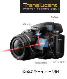 “Translucent Mirror Technology”(トランスルーセントミラー・テクノロジー)“α55”・“α33”は、光を通す透過ミラーを用いた、新開発“Translucent Mirror Technology”を搭載しています。従来の一眼レフカメラに採用されているミラーボックスの代わりに、光を通す透過ミラーを使った独自のミラーボックスを採用することで、常にオートフォーカスセンサーとイメージセンサーに光を当てることができるので、大型で高価なプロ用一眼レフカメラでしか実現していない秒間10コマの高速連写・追尾オートフォーカス※3や、世界初※1の動画撮影中のTTL位相差検出方式オートフォーカス、高精細ライブビューと高速オートフォーカスの両立、ボディの小型化などを実現しています。